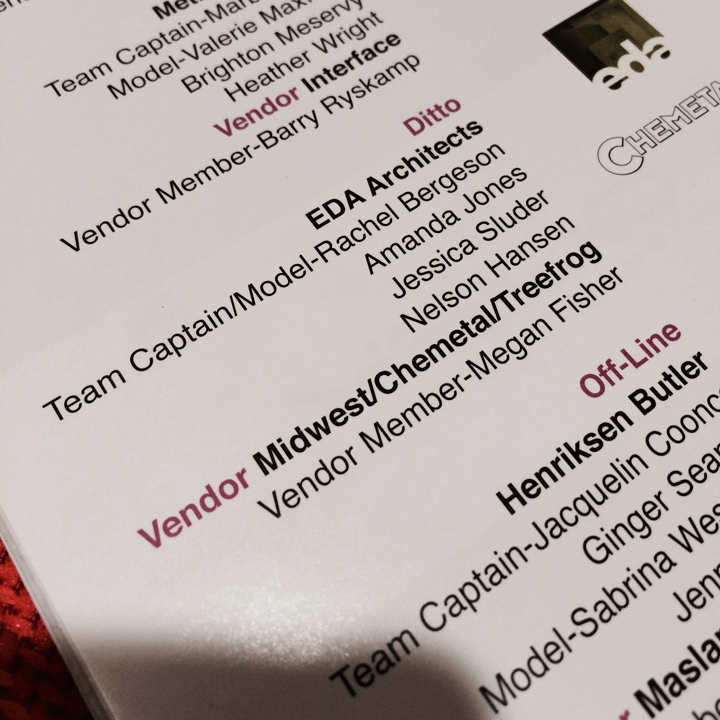 - Different material or product vendors sign up to sponsor a team with their product. Some materials/products are: Carpet, fabric, wall coverings, furniture manufacturers, lighting suppliers, stone and tile suppliers; basically any material in an interior.