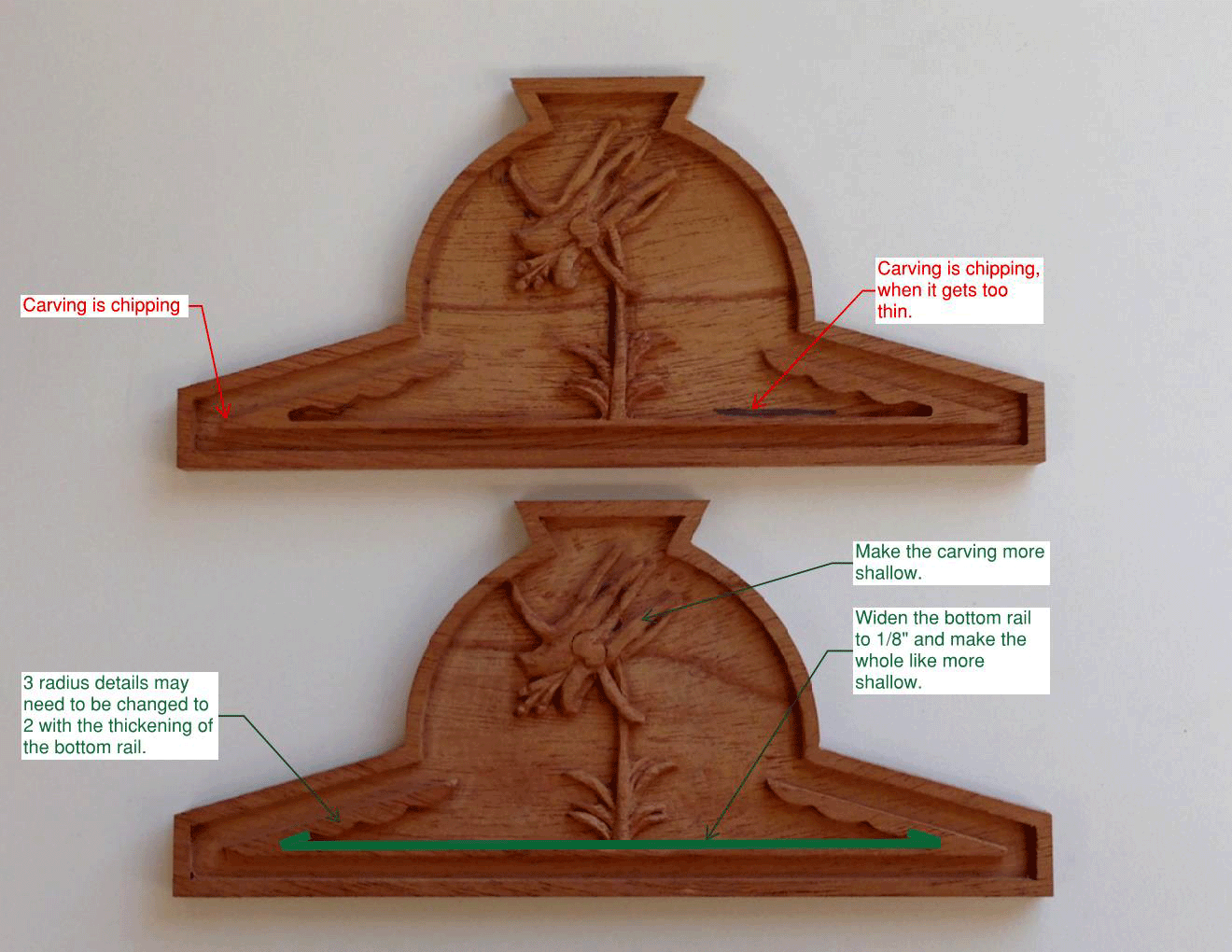 Because of the size and delicacy of the pattern, we are having a difficulty with the wood breaking and chipping. Below is my suggestion of how to remedy the problem.