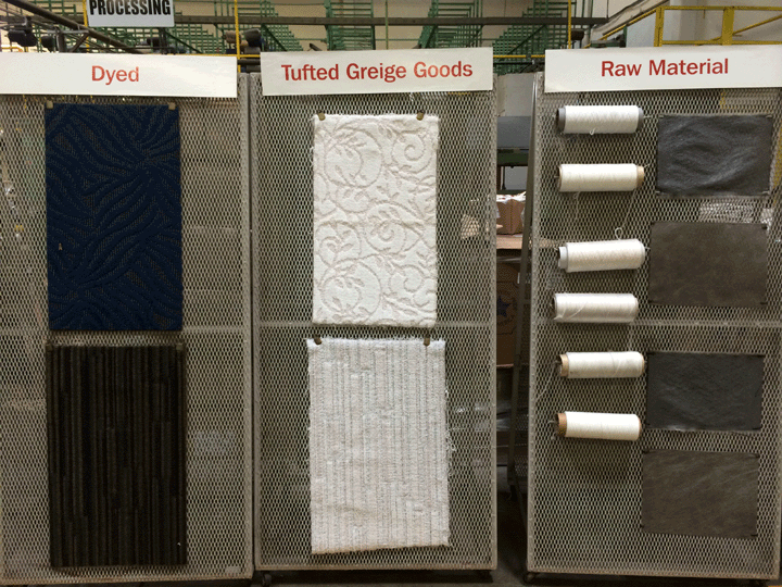 1. Griege Dyed goods that are all dyed after the carpet is tufted and Solution Dyed goods, where the color is in the yarns and then tufted. Below are some images of the different processes. To see some actual tufting go to my Instagram page.