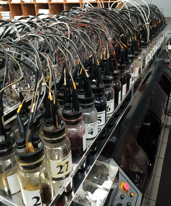 One of the things I liked the most about the trip was learning how patterns and designs get that way through their dyeing process. In greige goods, the yarns have characters or traits (“the affinity of the yarn”) that take dyes differently. There are also Acid base dyes and Cationic dyes. And these combined in carpets create and achieve the simple or complex design patterns. The second picture below is a computer system to systematically dispense the dyes into a dye bath for the perfect color formula. The third picture is where they are testing the color formulas on carpet samples. There is an Instagram video showing it in more detail.