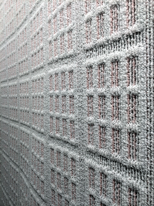 One of the things I re-learned on this trip is how carpet is really all about science. The first picture below shows plastic materials that represent the 4 types of yarn shapes manufactured by Invista. Without getting into all the details, the main two types of yarn DNA is type 6 and type 6,6. The most durable on the market is type 6,6. The square shape below is called “four hole hollow filament,” and is the 6,6 yarn. The second image shows a microscopic view of that yarn. If you can see little black dots in between these yarns, they are carbon filaments that are purposely placed there to keep the carpet users/owners from getting a shock – they draw the electric charge away from those that walk on it.