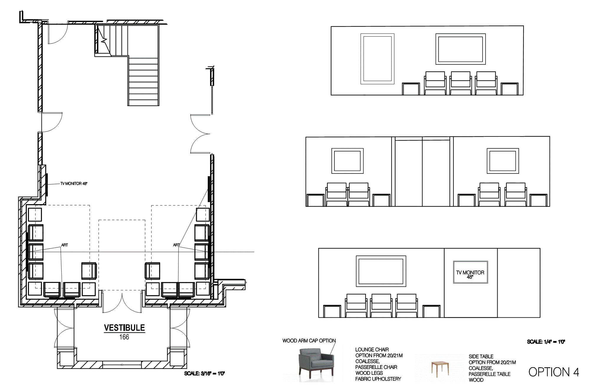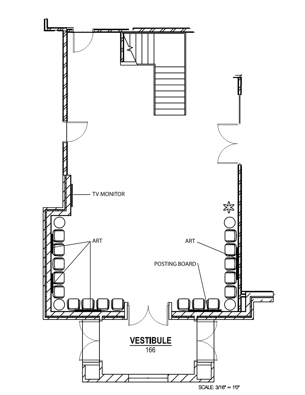 Research. I went to the lobby and watched how it was used. There was traffic patterns coming from literally 5 different hall/walk ways. It was a very busy lobby, without a lot of stopping to “smell the roses.” I felt that this lobby was more of a “perching” lobby, not for general kick back and relaxing. If there was some sitting down, it was only to wait for someone or look through their personal effects to find a needed item. This high traffic would also make it hard to have a floor rug – something I would normally suggest in a space like this. After hearing my explanation, the Owner agreed, yet requested we meet in the middle with one of submitted floor plan options: