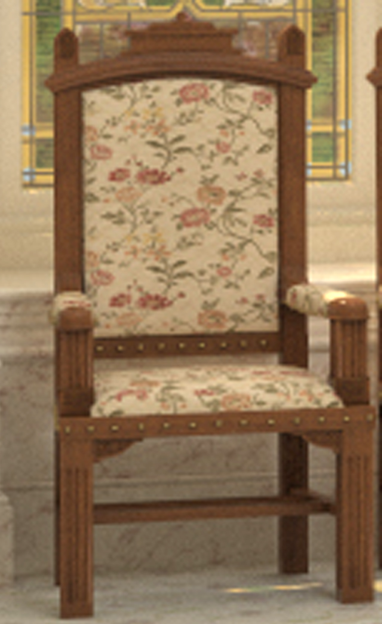 Next we rendered it with the upholstery, etc. for buy off from the Owner. This is the frontal view for an arm version of the chair. . (The Crown detail on the top had been modified from the sketches.)
